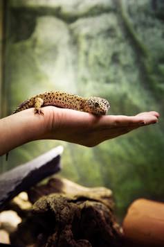 Redan före resan till Sydafrika har eleverna bekantat sig med kräldjur - här är skolans egen leopardgecko.