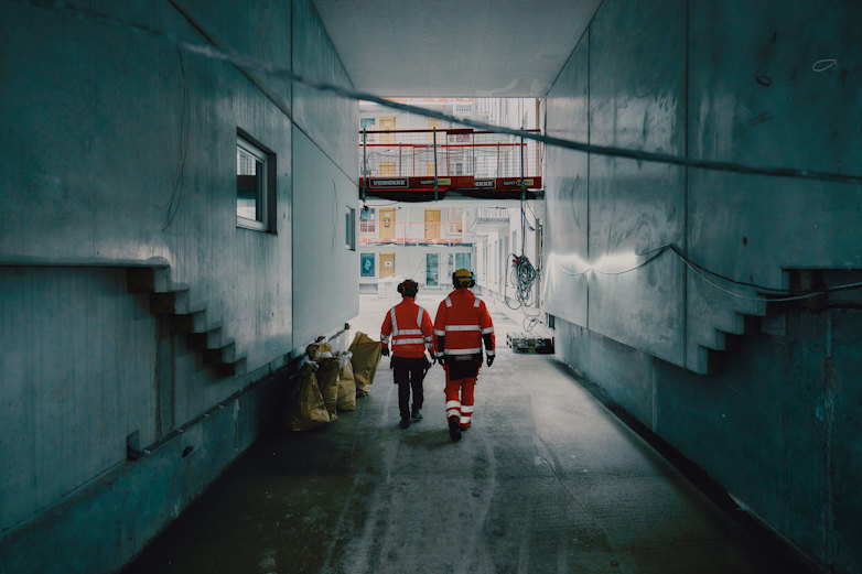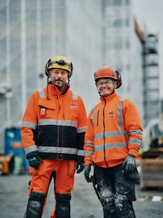 Stefan Johansson och Mehdi Ghulami på byggarbetsplatsen på Södermalm i Stockholm. Deras arbetsgivare Veidekke har ansökt om att gå med i satsningen på inkluderande apl. Foto: Oskar Omne