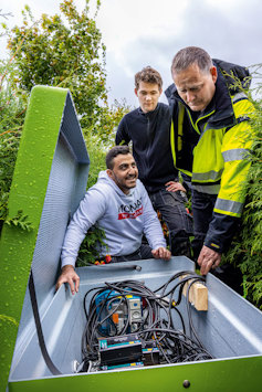 Yrkesläraren Bernt Johansson kontrollerar installationen utanför kyrkan tillsammans med eleverna Viggo Merler och Gorgeos Jerjas.
