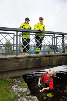 David Blomgren drar kabel på botten av Lillån vid stortorget i Alingsås. Kompisarna Joel Gudmundsson och Kevin Jansson står på bron och ger goda råd.
