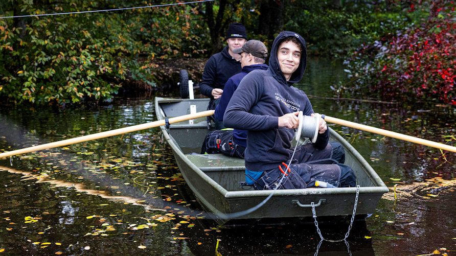 Det småregnar i Alingsås och blötast av alla grupperna är det för de fyra eleverna som spänner vajrar mellan två små öar en bit bort. Förutom att göra elinstallationerna har de också fått lära sig ro för att klara sitt uppdrag.