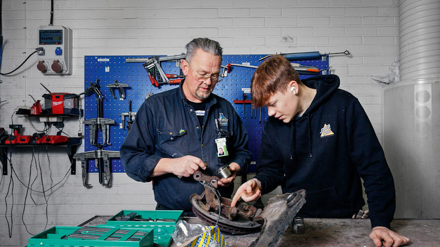 Läraren Hans Kristiansson och hans elev Theo utför kontroll i verkstaden. Hans Kristianssons fokus i undervisningen är drift- och underhållsteknik. Foto: Linnéa Tammerås.