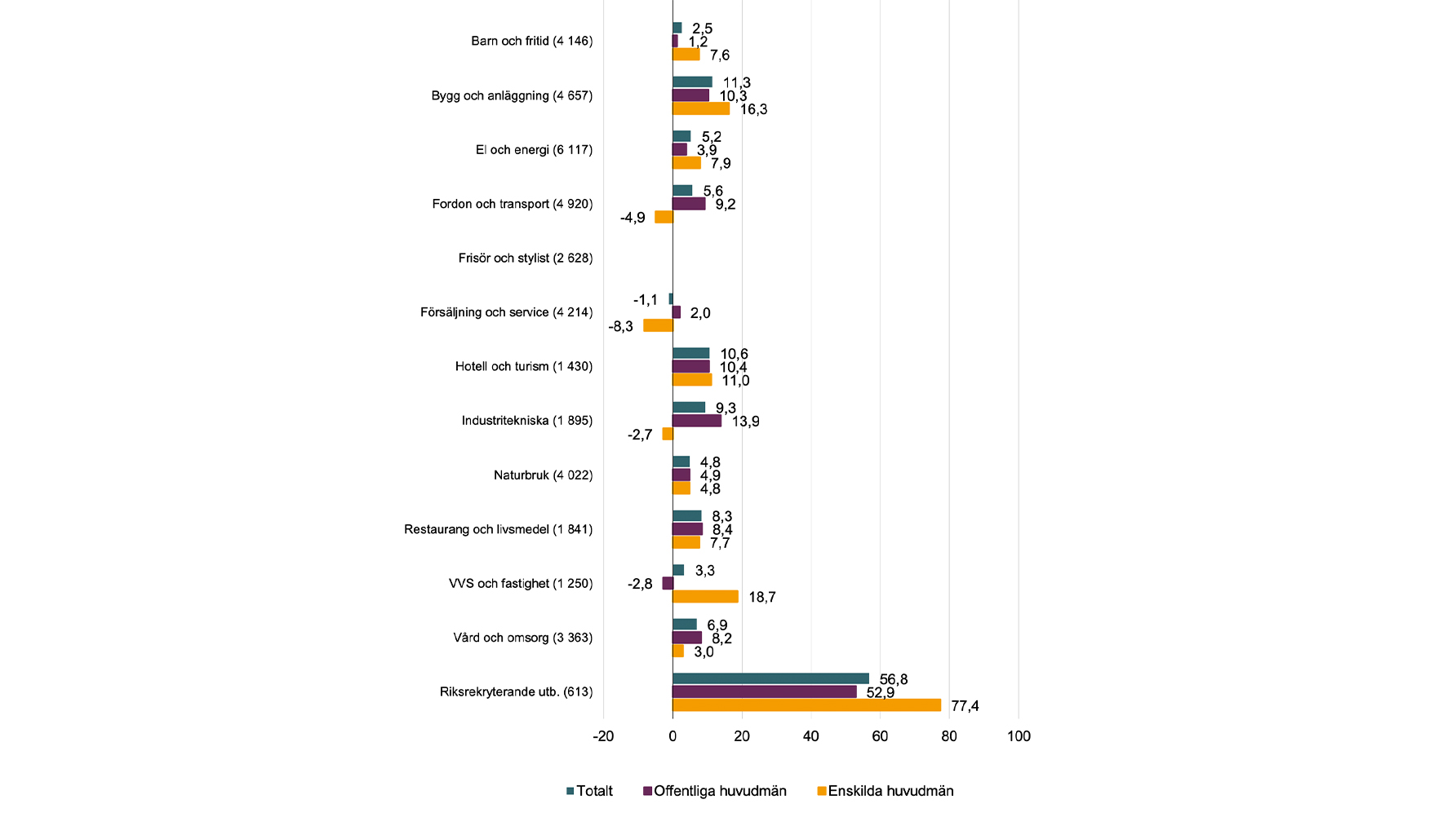 Rapporten presenterar även skillnader mellan enskild och offentlig huvudman, vilka är störst på fordon och transport, industriteknik, VVS och fastighet. På fordon och transport ökar elevantalet i årskurs 1 med drygt 9 procent i offentlig regi jämfört med förra läsåret, medan det minskar med 5 procent hos enskilda huvudmän. Industritekniska programmet visar samma mönster: upp 14 procent i offentlig regi, men ned knappt 3 procent hos enskilda. För VVS och fastighet är det tvärtom. Där ökar enskilda huvudmän med närmare 19 procent, medan offentlig regi minskar med nästan 3 procent. Även riksrekryterande utbildningar ökar mer hos enskilda huvudmän.