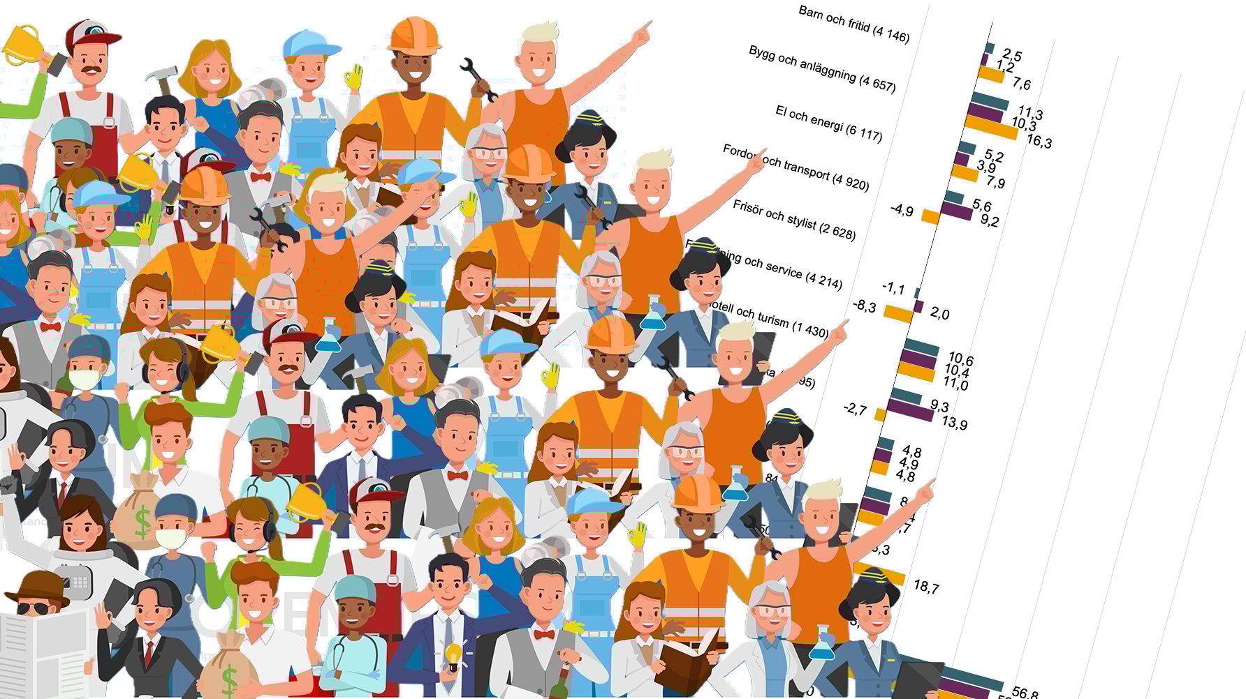 Förra året tappade bygg och anläggningsprogrammet flest elever jämfört med året innan, men nu ökar antalet elever i årskurs ett med 11 procent, vilket är den största ökningen på samtliga yrkesprogram. Därefter följer hotell- och turismprogrammet med en ökning på nära 11 procent, industritekniska programmet med 9 procent och restaurang- och livsmedelsprogrammet med 8 procent. Även det nya frisör- och stylistprogrammet lockar fler elever än tidigare. I år går 2 630 elever i årskurs 1, jämfört med 2 390 på hantverksprogrammet med motsvarande inriktning förra läsåret.