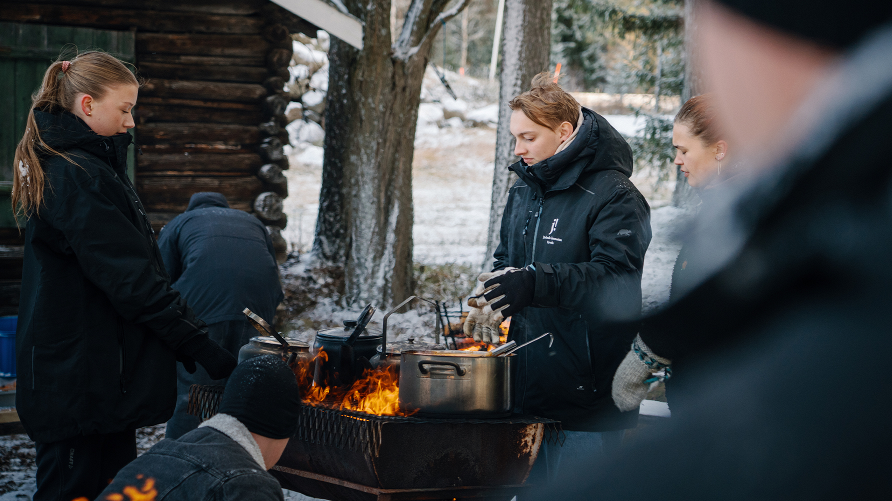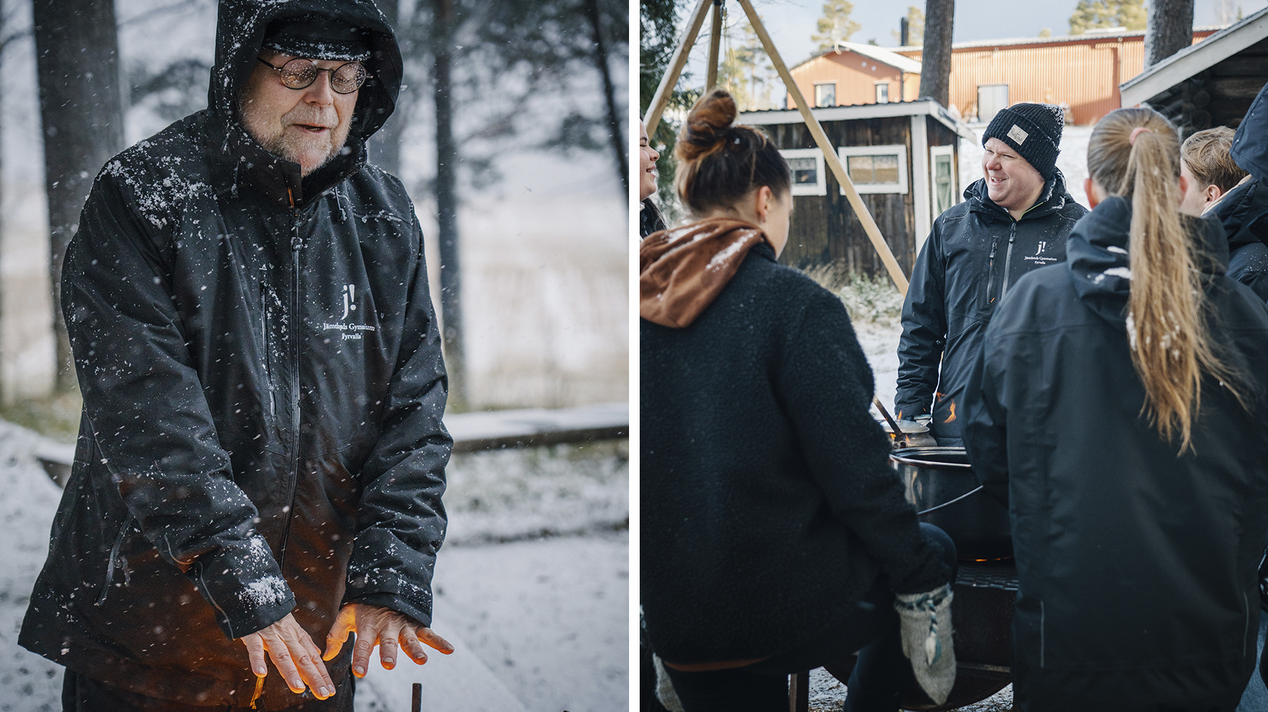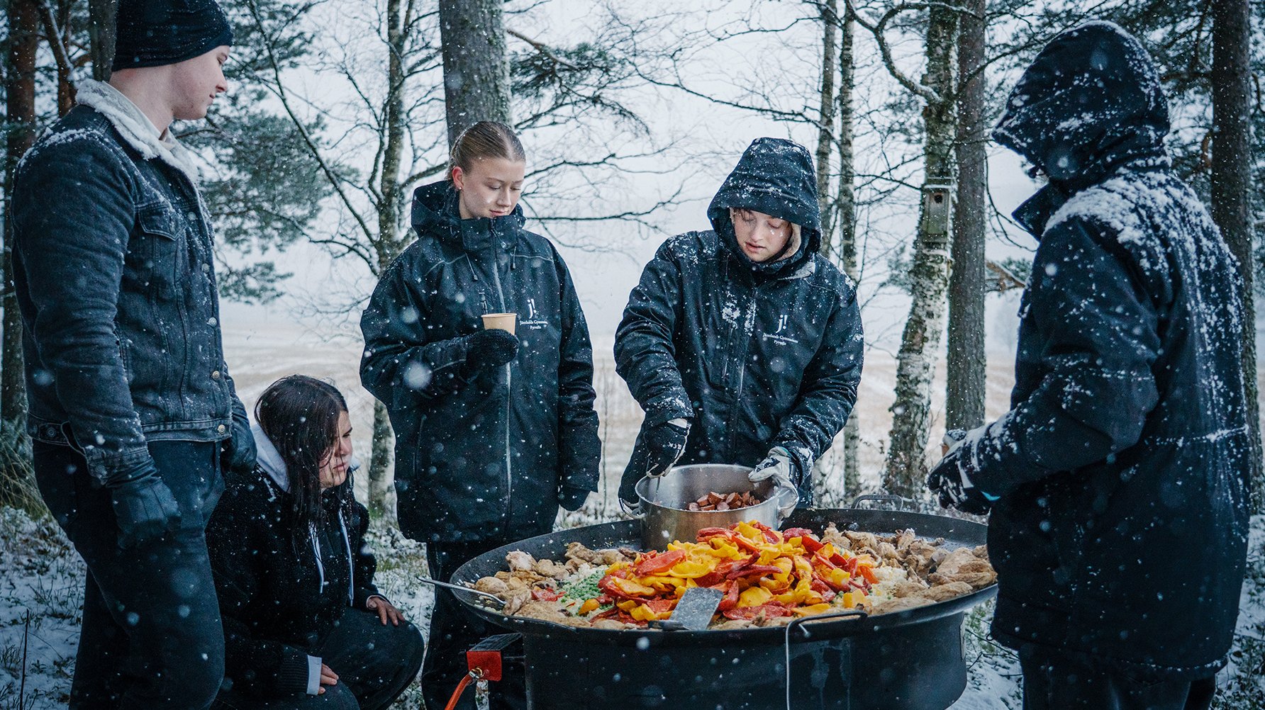 Vinden tilltar i styrka och snön yr ordentligt över samlingsplatsen vid Yttergärde i Oviken, cirka 45 minuters bilväg från Östersund. Men eleverna från restaurang- och livsmedelsprogrammet på Jämtlands gymnasium Fyrvalla knorrar inte, de arbetar noggrant vidare med sina förberedelser. Träklabbarna i eldkorgarna tänds på liksom den stora grillen där kannorna med kokkaffe snabbt kommer på plats. Stekhällens ben skruvas fast och gasolbehållarna kontrolleras, och alla fat och bunkar med korv, ris, kyckling och andra ingredienser till dagens paella-lunch hämtas ner från minibussarna som står parkerade uppe vid ett auktionsverk strax intill.