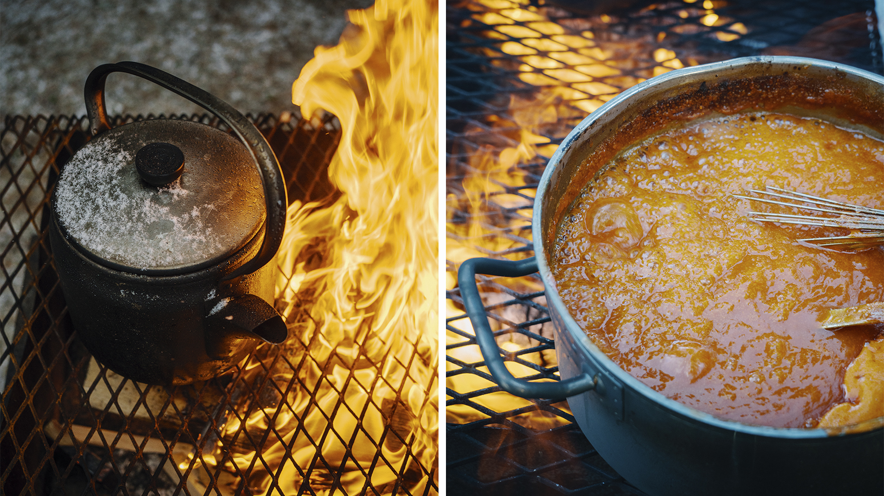 Trots att eldarnas lågor sprider en del värme i snöyran så är det fortfarande ganska kyligt, i synnerhet om man inte rör så mycket på sig. Men Örjan Benjaminsson, en annan av lärarna på restaurang- och livsmedelsprogrammet, har tagit med sig egentillagad nyponsoppa som värms upp på eldstaden. En stund senare får eleverna en välförtjänt paus och greppar muggarna med den rykande, heta soppan. Den värmer gott och smakar himmelskt. Förklaringen till det där lilla extra är blodapelsinpuré, vilket Örjan Benjaminsson avslöjar att han brukar blanda i som extra smaksättare.