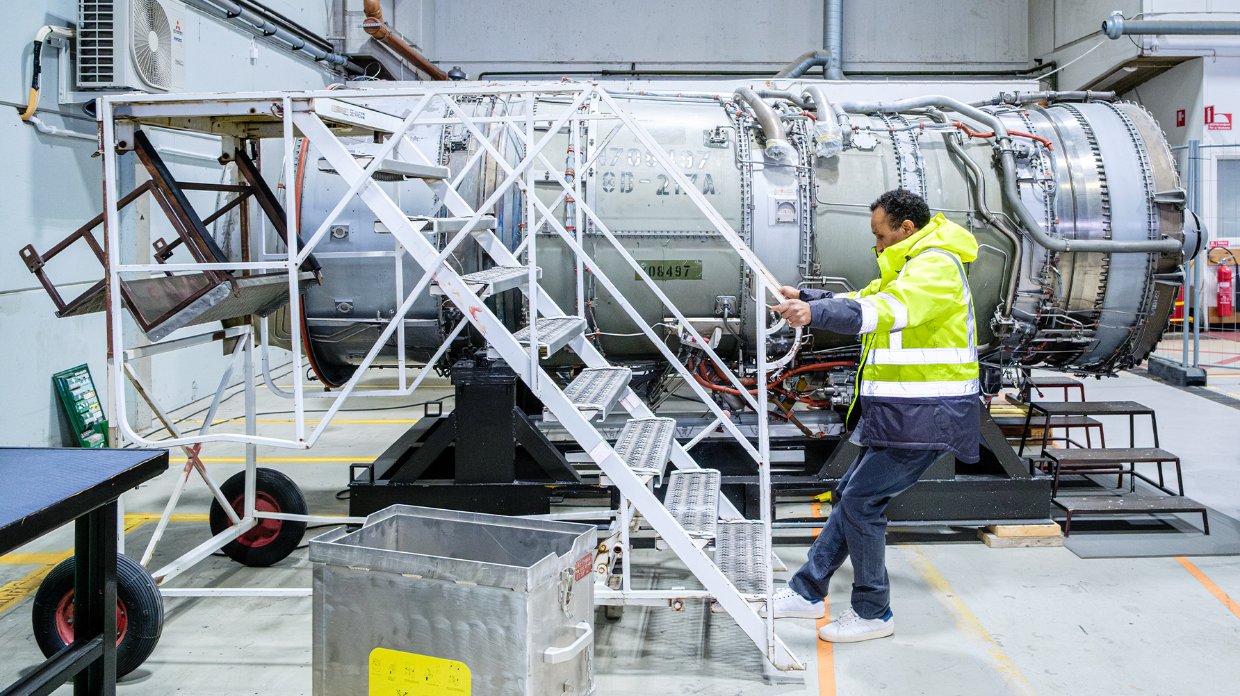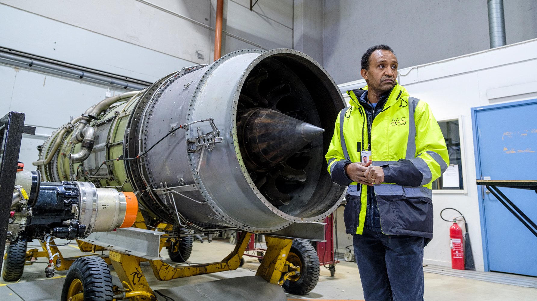 När vi följer honom in i hangaren förändras tempot direkt. Flygplatsens brus byts mot metalliska klick från verktyg, lågmälda instruktioner och doften av olja och kall metall. Motorer står uppradade som blanka stålkroppar, och verktygen ligger exakt där de ska. Det är här, mitt bland arbetsbänkar och flygkomponenter på Arlandagymnasiet, som Yonatan Goitom arbetar som yrkeslärare på flygteknikutbildningen.