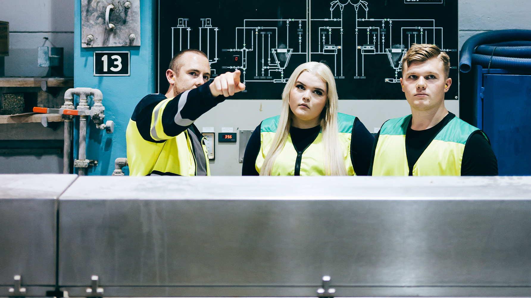 För en oinvigd kan fabriksmiljön vara omtumlande med dess enorma ytor. Från vänster: Yrkesläraren Alex Olausson och eleverna Anna Hunt Rosén och Neo Claesson. Foto: Fredrik Jalhed.