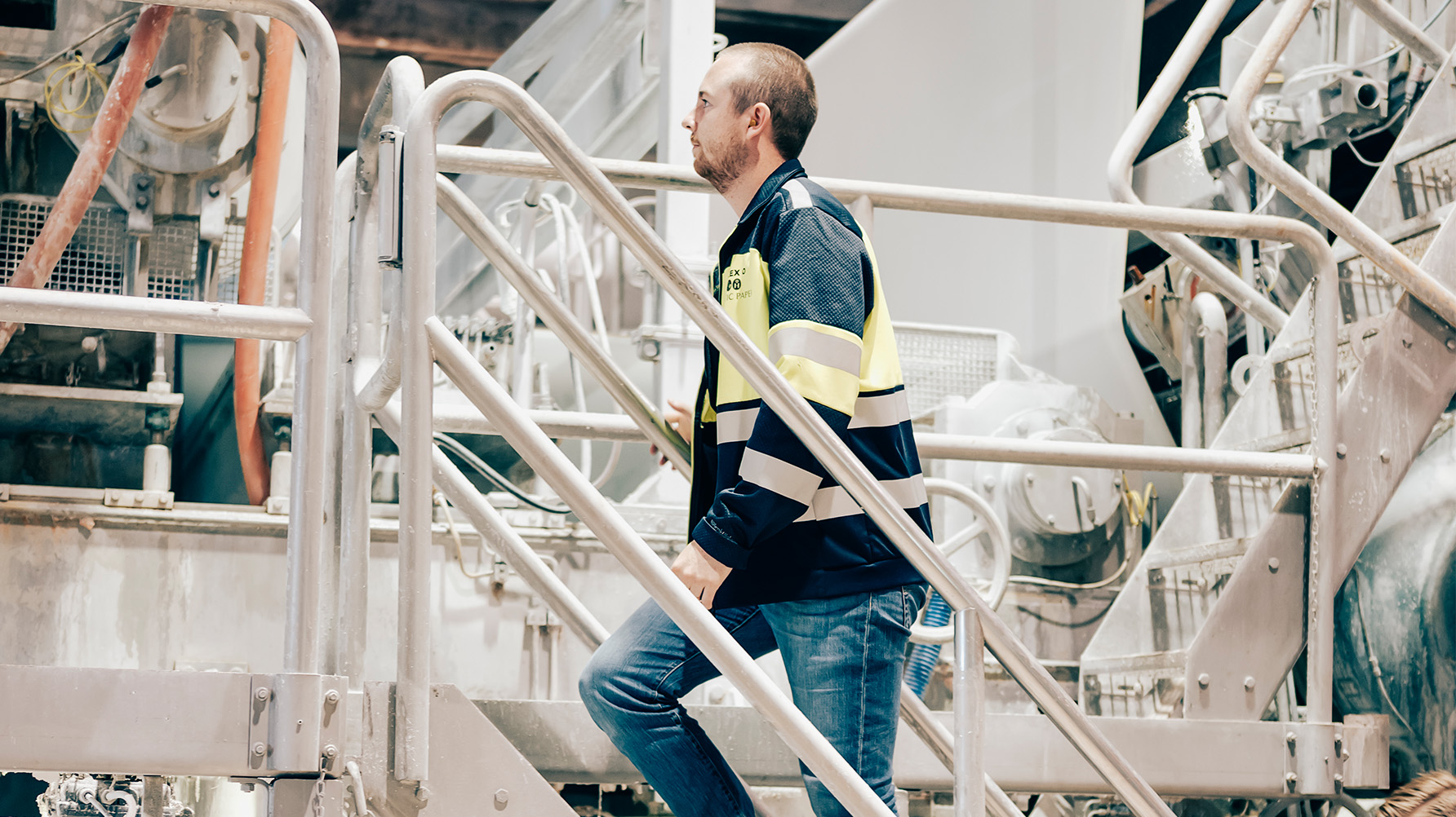 Det dunsar, fräser och slamrar. Ljudet från papperstillverkningsmaskinerna tränger sig på trots hörselskydden. Dessutom är det extremt fuktigt och varmt, lite som en het solig sommardag. Inne i kontrollrum ”PM8” mitt i fabriken – pappersmaskin 8 – är det däremot både svalt och tyst. De tre operatörerna på skiftet vakar över skärmarna framför sig, där siffror, diagram och kameraövervakningsbilder visar att papperstillverkningen rullar på som den ska.