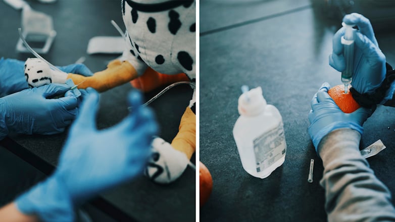 Eleverna får börja med att träna injektioner på apelsiner och ta blodprov på låtsastassar innan de går vidare till verkliga moment, alltid under handledning av yrkeslärare och veterinär. Foto: Oskar Omne.