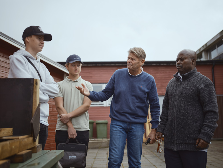 Han går runt bland eleverna som sitter och klurar på sina företagsplaner. En grupp vill göra dricksglas av returflaskor, en annan vill sy tygpåsar av slitna jeans. En tredje vill göra blomlådor – de har redan ritningar färdiga i blocket - och en fjärde ska bygga utemöbler av begagnade lastpallar.