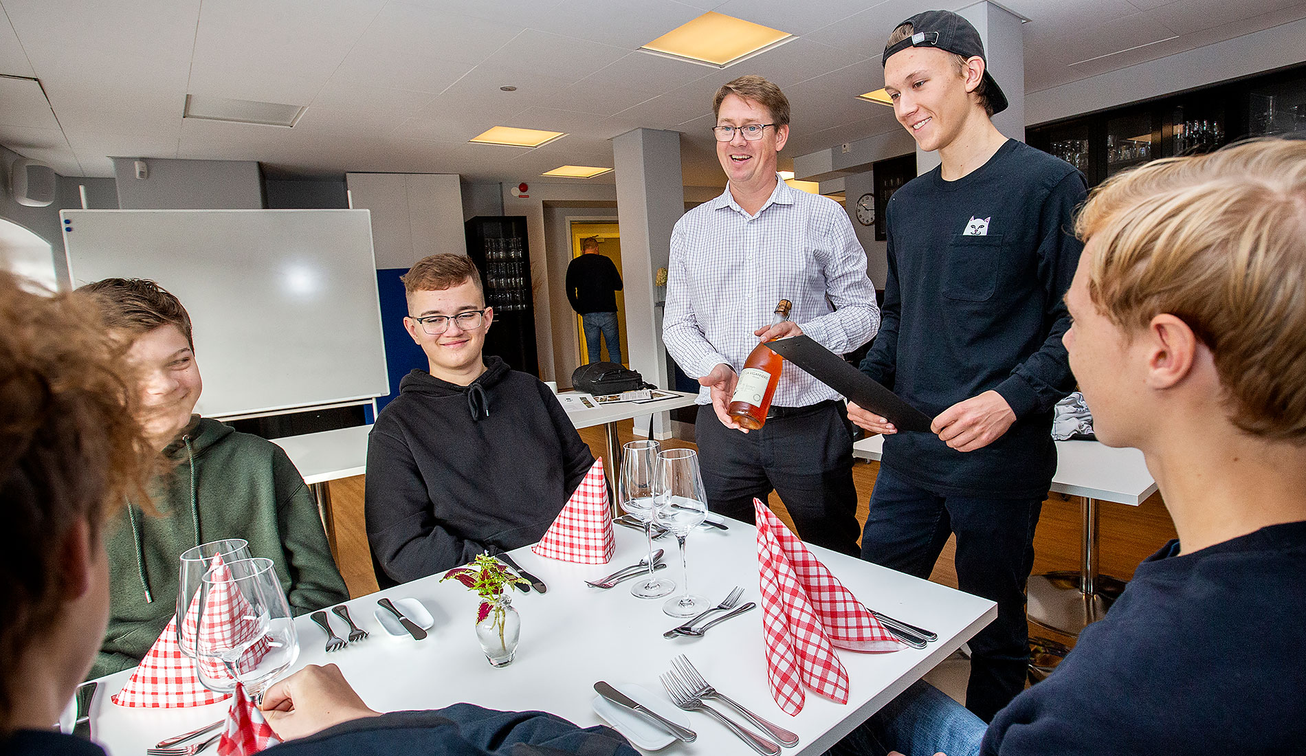 – Motivationen ökar hos eleverna när vi knyter an till områden om restaurang. Jag kan inom deras yrkesinriktning smyga in viktiga delar som ingår i svenskämnet. Att skriva och hålla tal som vi arbetar med nu fungerar utmärkt här i restaurangen, säger han.