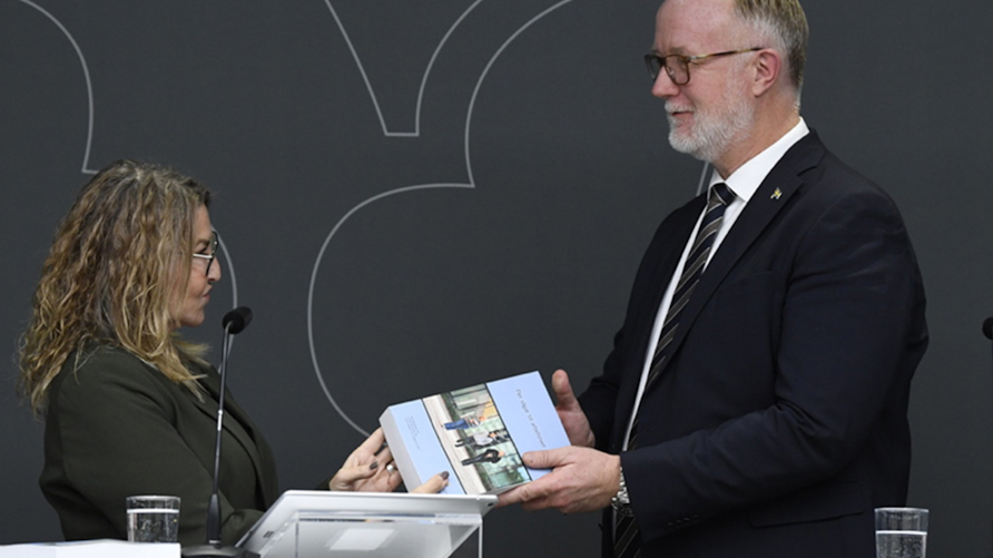 I dag, den 20 november, har utredningen om "Fler vägar till arbetslivet" överlämnat sina förslag till utbildningsminister Johan Pehrson. Till vänster utredaren Joanna Giota. Foto: Jakob Åkersten Brodén/TT.