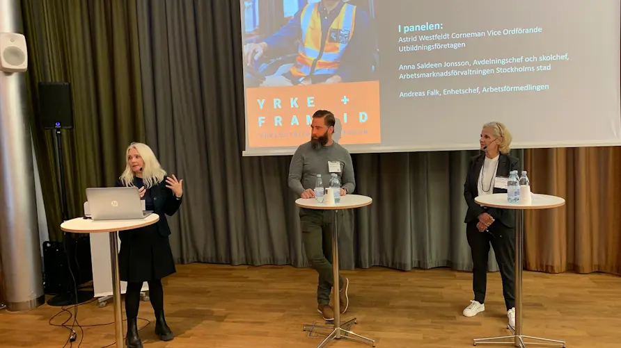 Anna Saldeen Jonsson, skolchef i Stockholm, Andreas Falk, enhetschef på Arbetsförmedlingen och Astrid Westfeldt Corneman, vice ordförande för Utbildningsföretagen diskuterade hur fler ska nås av yrkesutbildning.